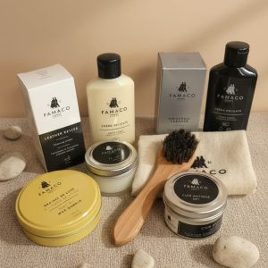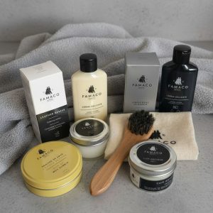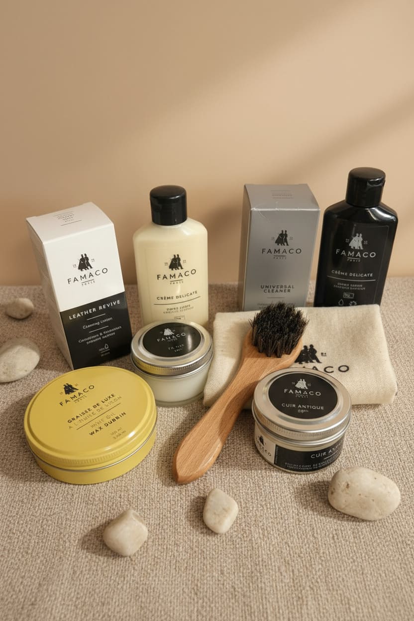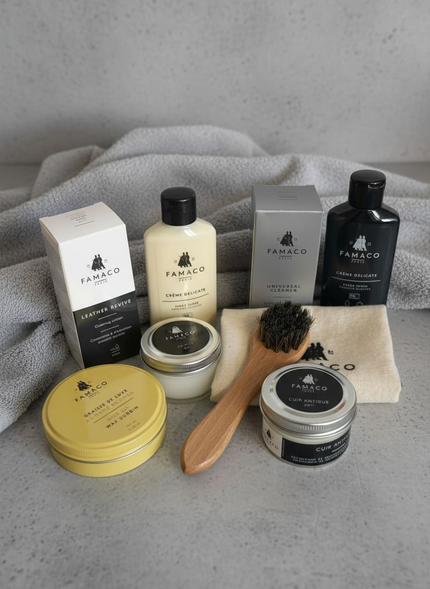 El set completo de cuidado Famaco Paris reúne todo lo necesario para mantener tus bolsos y complementos de piel en estado impecable. El limpiador universal elimina suciedad y residuos, la loción Leather Revive limpia y acondiciona sin resecar y la Crème Délicate nutre en profundidad para devolver flexibilidad y brillo natural. Las ceras en crema y en lata realzan el color y crean una capa protectora que ayuda a repeler la humedad y a prolongar la vida del cuero. El cepillo de madera con cerdas naturales retira polvo y permite un pulido uniforme, mientras la bolsa de algodón guarda las piezas con suavidad. Un ritual profesional en casa que limpia, nutre, protege y pule en cuatro pasos sencillos. Recomendado para cuero liso de bolsos, carteras y cinturones. Evita ante y nobuk y realiza siempre una prueba en una zona poco visible.