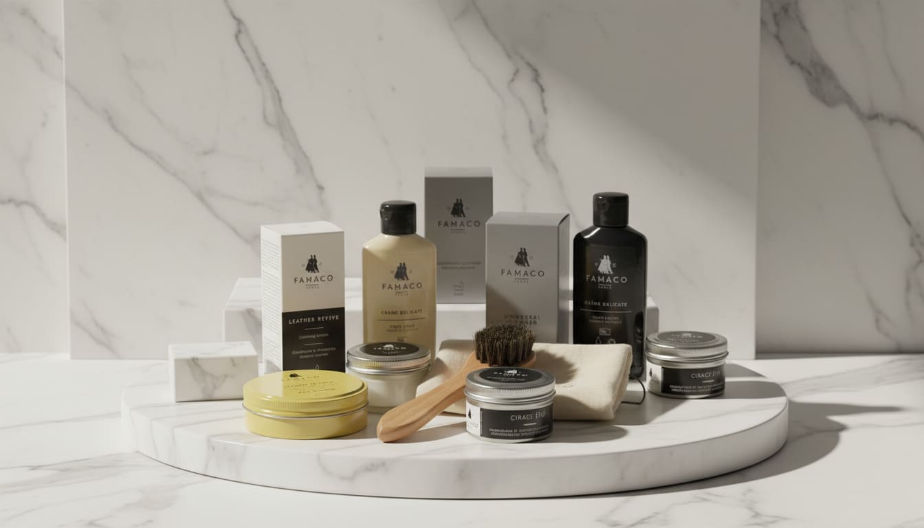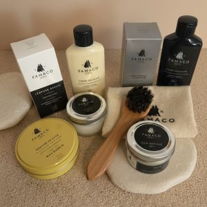 Set completo Famaco Paris para limpieza, nutrición y protección del cuero con limpiador universal, Leather Revive, Crème Délicate, ceras de acabado, cepillo de cerdas naturales y bolsa de algodón. Ideal para bolsos y accesorios de piel lisa.